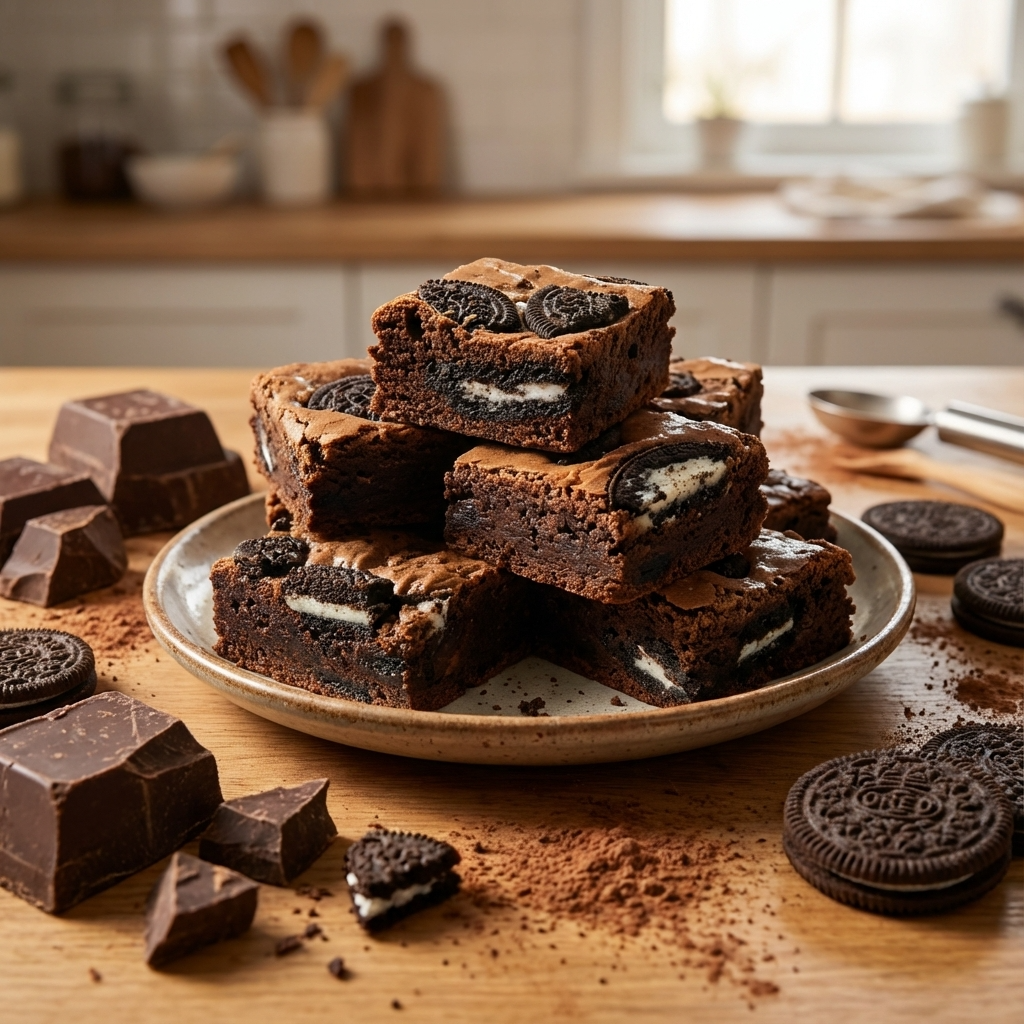 Filled with an irresistible mixture of cookies and cream and topped with cookie chunks, this is one decadent chocolate brownie.
